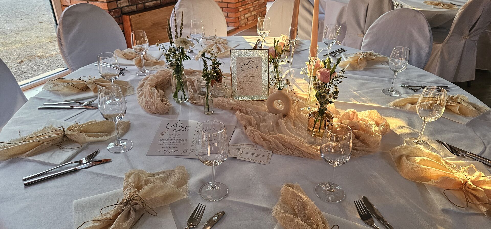 Ihr möchtet die Dekoration selbst gestalten? Sehr gern – bei uns habt Ihr volle kreative Freiheit. Auf Wunsch stellen wir Euch Kerzenhalter, Tischwäsche und weitere Basics zur Verfügung, die Ihr ganz nach Euren Vorstellungen einsetzen könnt.